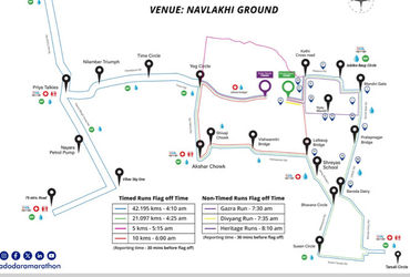 શહેરના નવલખી મેદાન ખાતેથી વહેલી સવારે ૪:૧૦ કલાકે રાજ્યના ના. મુખ્યમંત્રી હર્ષ સંઘવીના હસ્તે મેરેથોનને ફ્લેગ ઓફ આપવામાં આવશે. દોડશહેરના વિવિધ મુખ્ય માર્ગો પરથી પસાર થઈ અકોટા બ્રિજના સોલાર પેનલ ખાતે પુર્ણ થશે.