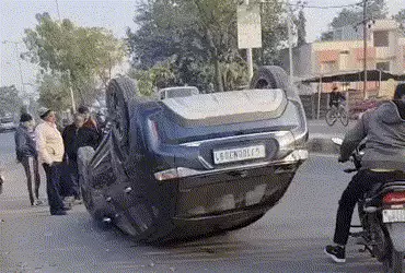 જામનગરમાં રણજીત સાગર રોડ પર ગ્રીન સિટી પાસે બેકાબુ બનેલી કાર પલટી : મોર્નિંગ વોક કરી રહેલા વ્યક્તિને ફંગોળ્યો | A car overturned near Green City on Ranjit Sagar Road in Jamnagar