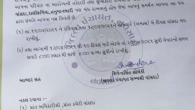 વાંસદા હનુમાનબારી અને રાણીફળિયા માં રવિવારથી સ્વૈચ્છિક લોકડાઉન અમલી બજારો બંધ રહેશે.